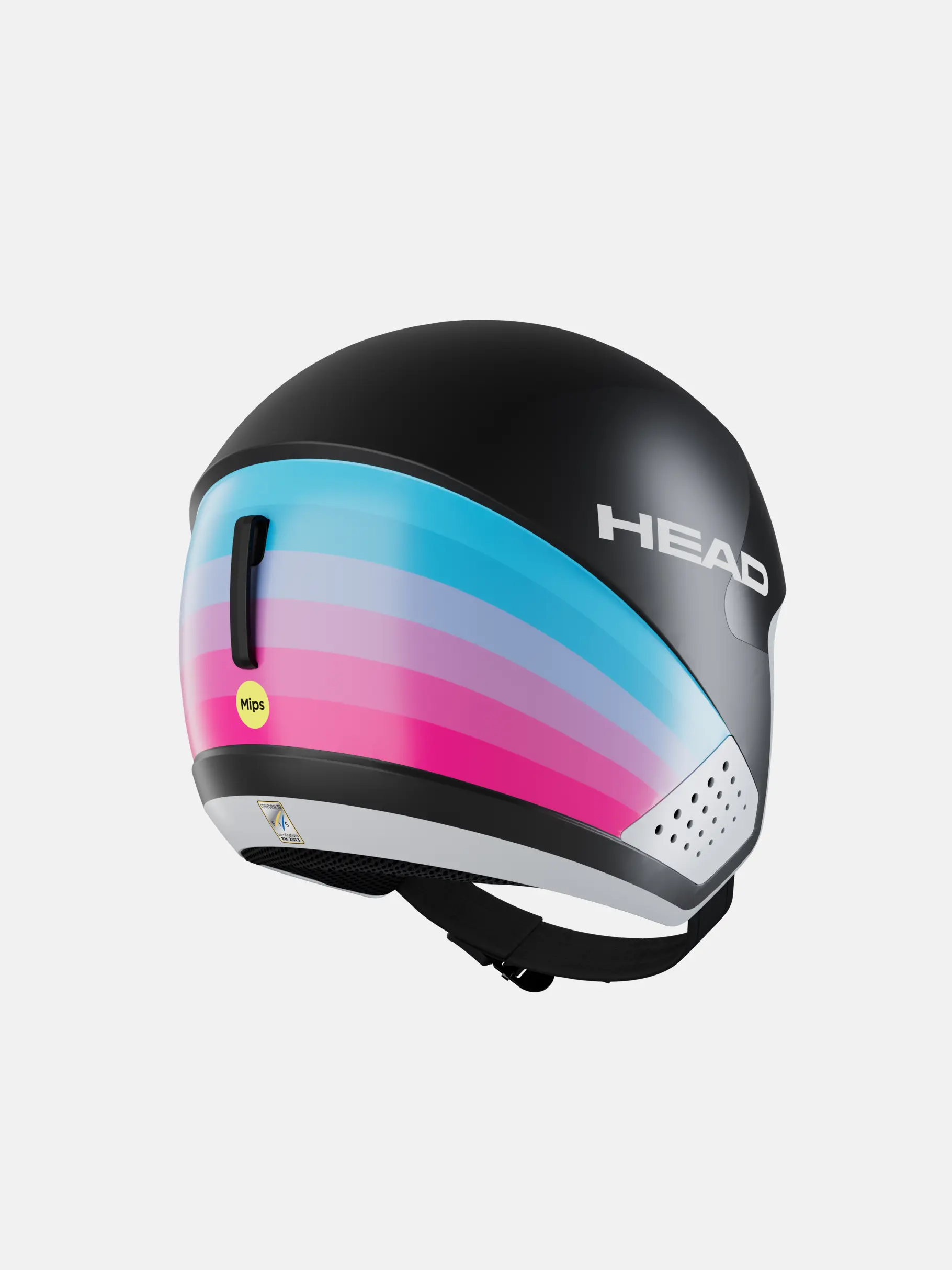 Un casco da gara aerodinamico di alta gamma con tecnologia MIPS, progettato per tutte le discipline di sci alpino. La struttura RD presenta un rinforzo in carbonio nella parte anteriore per resistere agli urti contro i pali da slalom e una lamina trasparente per una maggiore protezione.